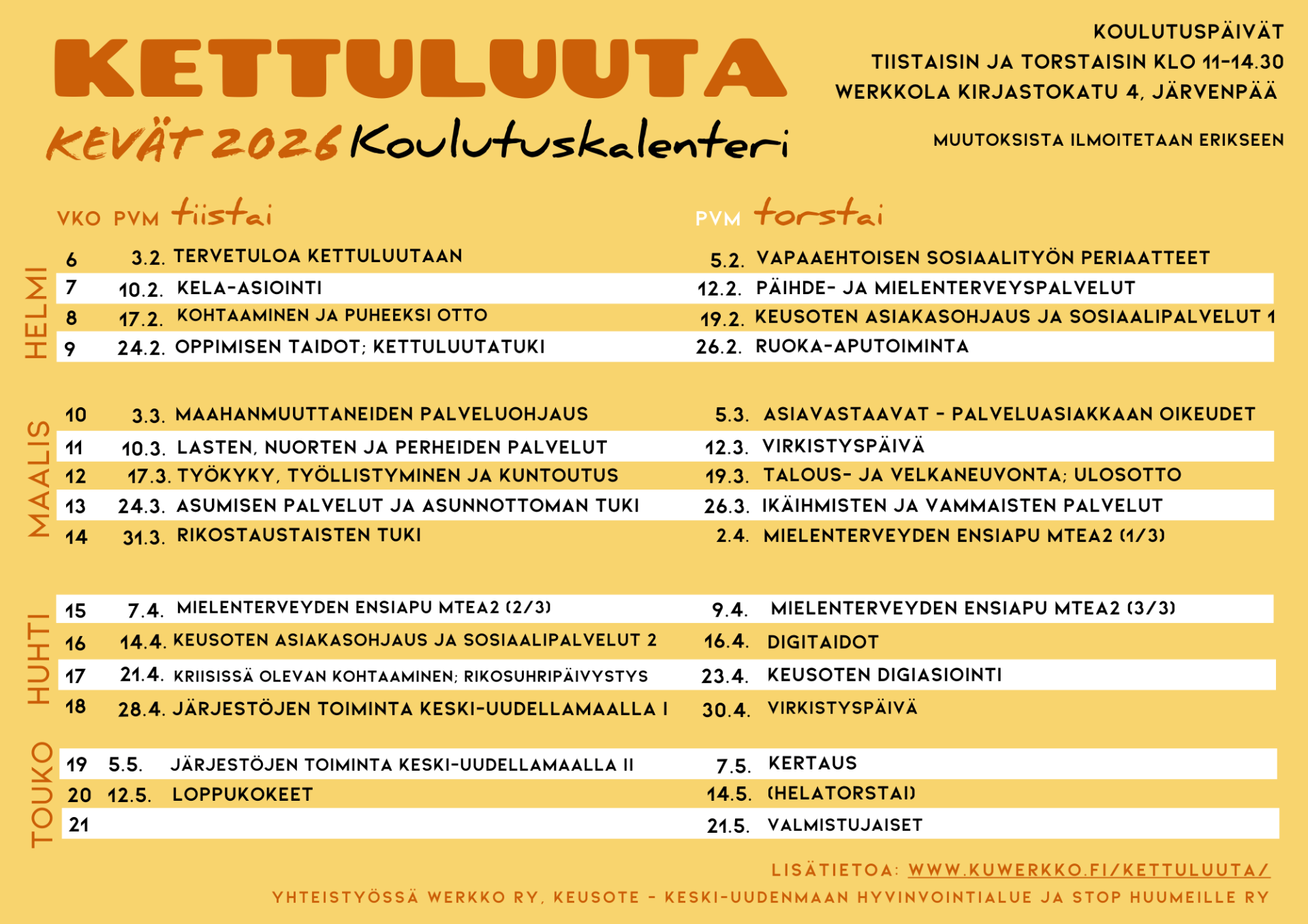 - Lue lisää kettuluuta-koulutuksesta täältä. Onko sinulla kokemusta erilaisten palveluiden käyttämisestä? Haluaisitko auttaa muita löytämään sopivat palvelut ja tuen erilaisissa elämäntilanteissa? Kouluttaudu kettuluuta-vertaispalveluohjaajaksi Keski-Uudellemaalle. Seuraava koulutus alkaa keväällä 2026.