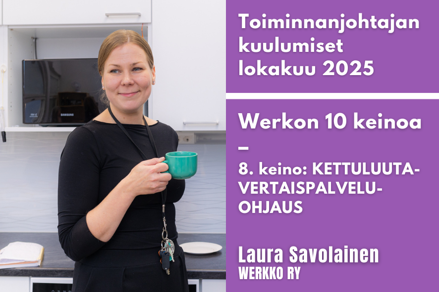 Valitsin Werkon kahdeksanneksi esiteltäväksi keinoksi KETTULUUTA-VERTAISPALVELUOHJAUKSEN. Onko sinulla kokemusta erilaisten palveluiden käyttämisestä? Haluaisitko auttaa muita löytämään sopivat palvelut ja tuen erilaisissa elämäntilanteissa? Kouluttaudu Kettuluuta-vertaispalveluohjaajaksi Keski-Uudellemaalle! Tarvitsetko sinä tai vaikkapa läheisesi tukea erilaisten hakemusten ja lomakkeiden täyttämisessä tai oikeiden palvelujen etsimisessä? Käy pyytämässä neuvoa Kettuluuta-tukipisteissä!