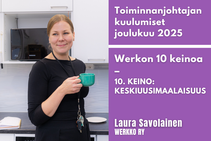 Valitsin Werkon kymmenenneksi esiteltäväksi keinoksi Werkon KESKIUUSIMAALAISUUDEN. Keski-Uudenmaan vertais- ja kokemusasiantuntijatoiminnan tuki Werkko ry:n kotipaikka ja toimitila "Werkkola" on Järvenpäässä Kirjastokadulla, mutta toiminta-aluettamme ovat muutkin Keski-Uudenmaan hyvinvointialueen paikkakunnat eli Järvenpään lisäksi Hyvinkää,...
