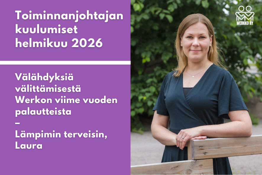 Tässä kuulumistekstissä halusin pysähtyä hetkeksi muistelemaan viime vuoden onnistumisia ja vuoden aikana koettuja yhteisiä hetkiä Werkon osallisuutta vahvistavassa ja kohtaavassa toiminnassa. Päätin siten nostaa tekstiini muutamia "välähdyksiä välittämisestä" eli positiivisia palautteita, joita saimme viime vuonna toiminnassamme mukana olleilta ihmisiltä (kiitos teille!)