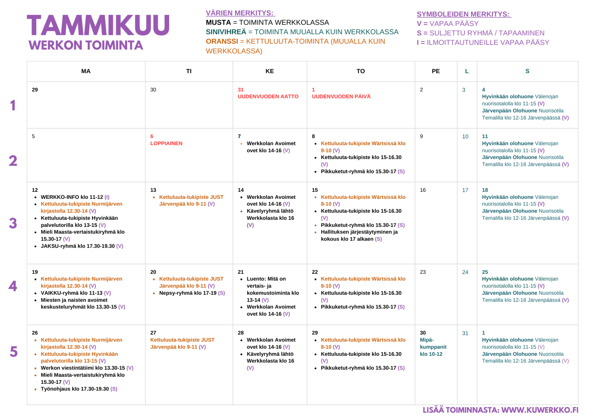 - Werkon Tuusulan olohuone tiistaisin klo 12-15 Hyrylän nuorisotilassa 13.1.2026 alkaen. Lue lisää täältä (avoin kaikille, ei ilmoittautumista tai sitoutumista, maksuton)